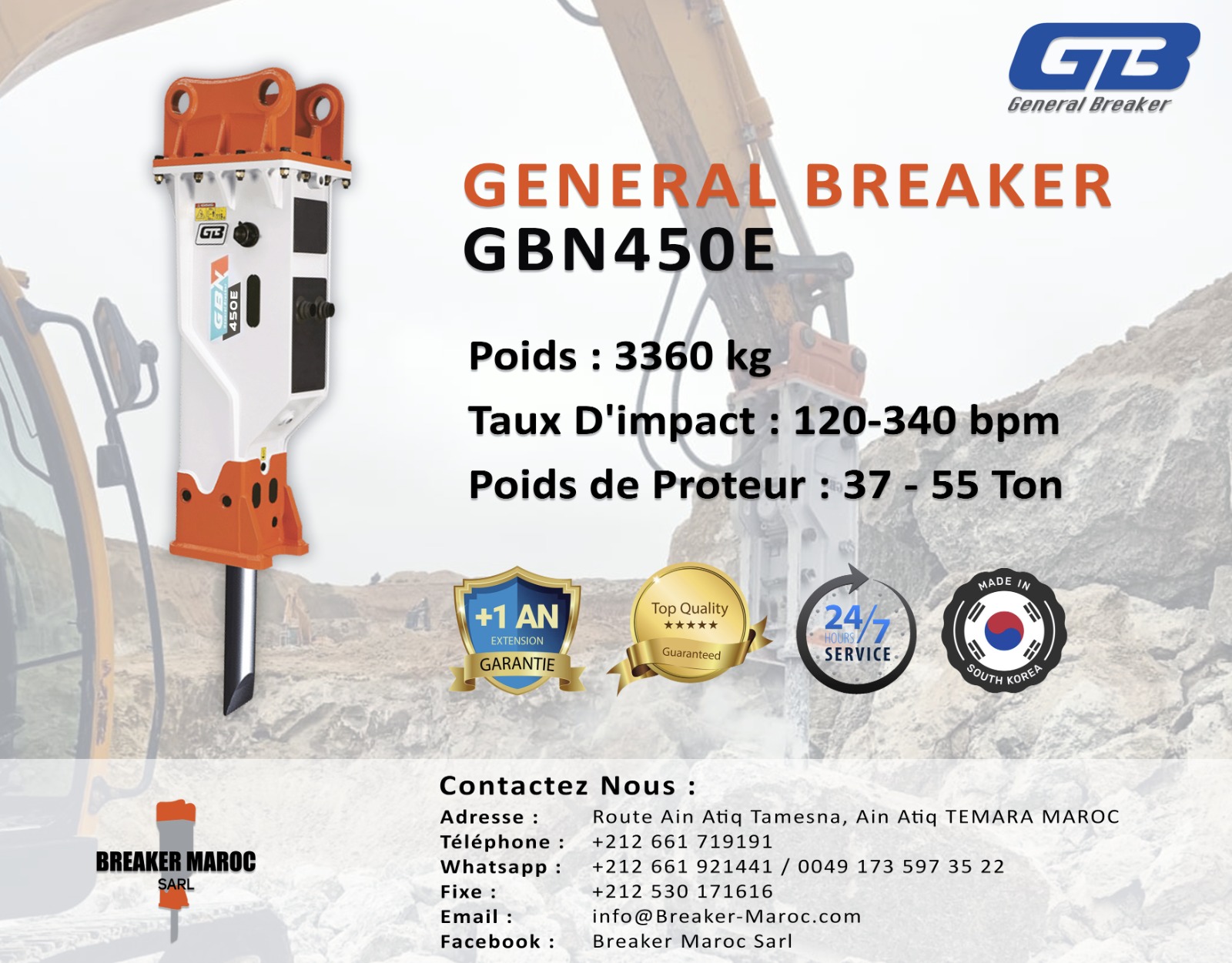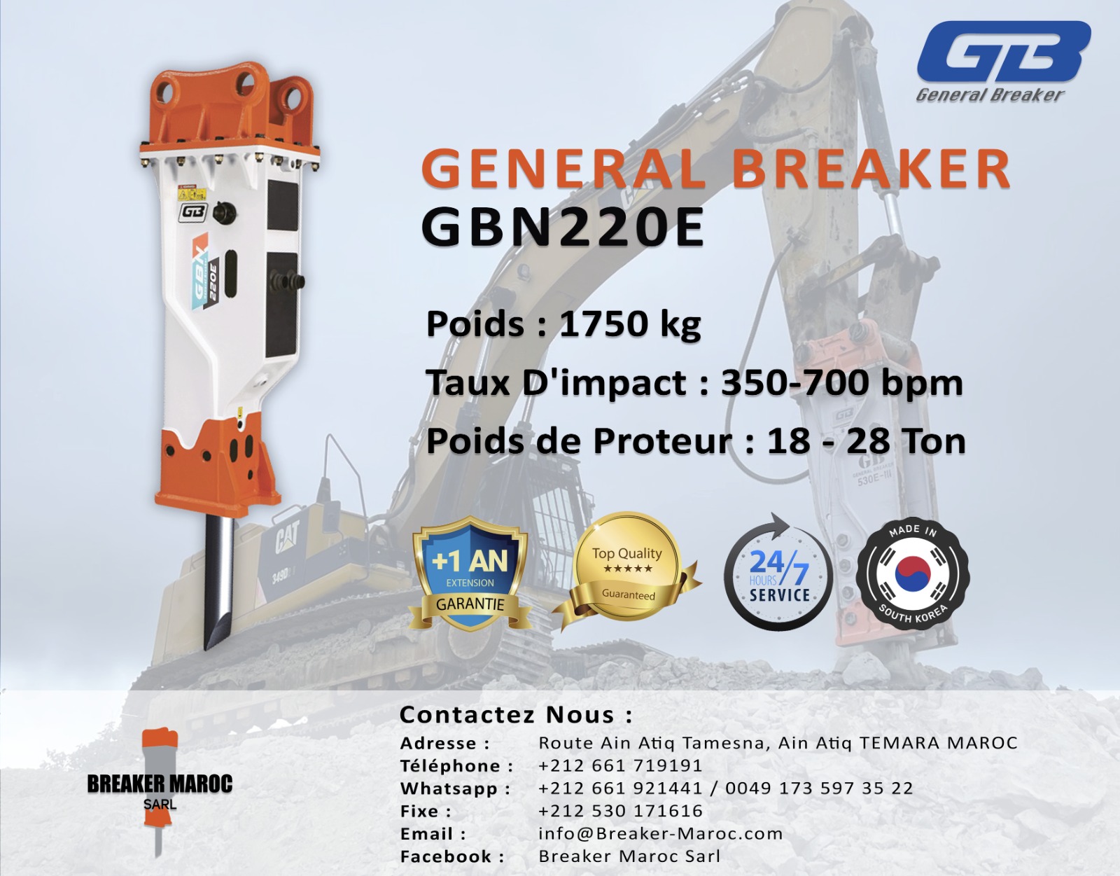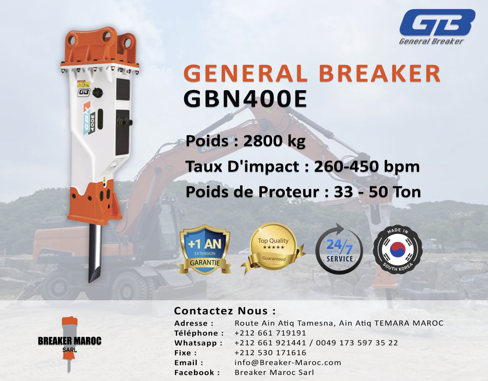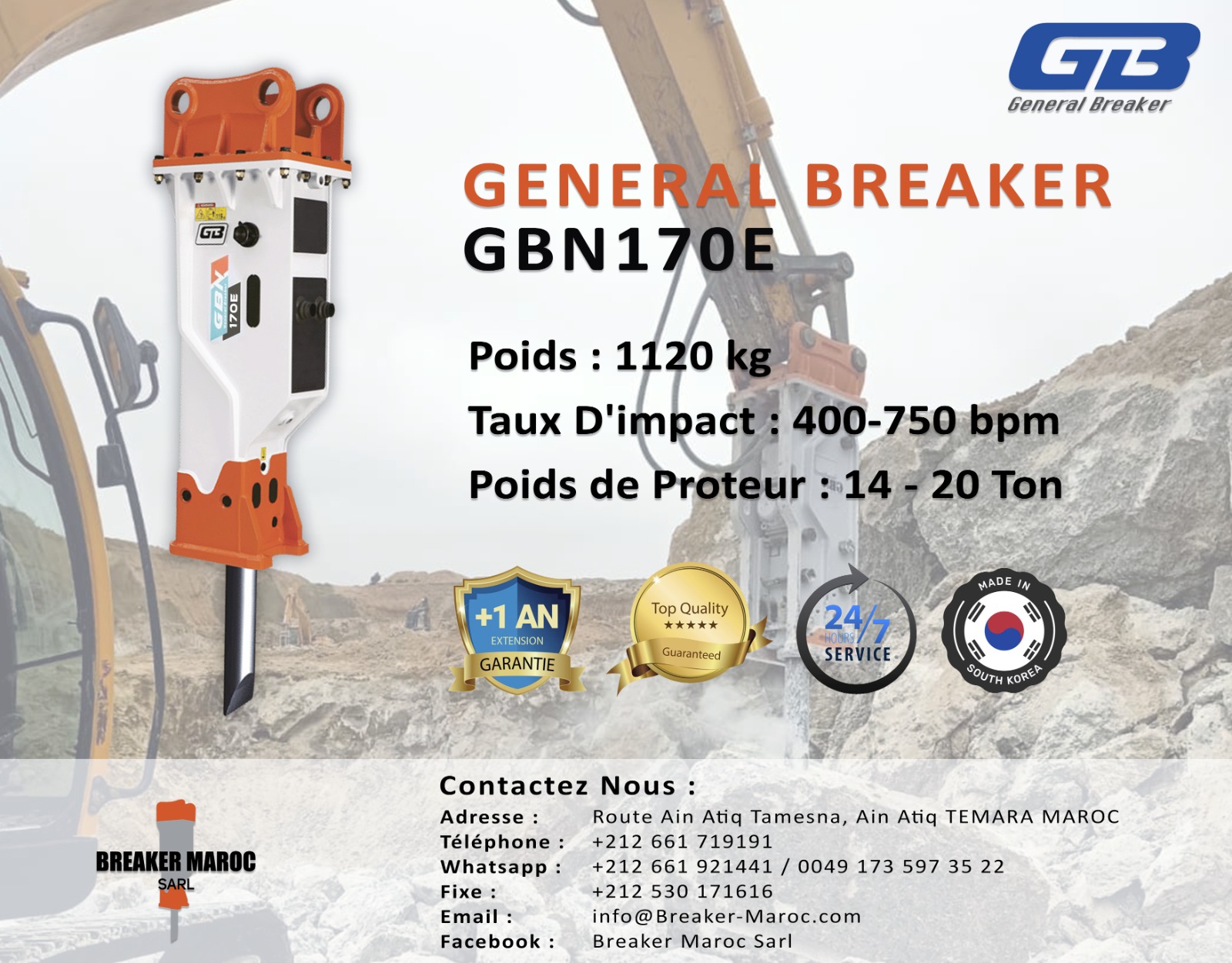 Breaker Maroc SARL est le distributeur exclusif au Maroc et en Afrique de l'Ouest de la société General Breaker, spécialisée dans la fabrication des marteaux et des outils hydrauliques pour les pelles. Nos produits offrent la qualité nécessaire pour faciliter le travail dans des conditions difficiles, et c'est le résultat de 33 ans d'expérience dans la fabrication et les services..